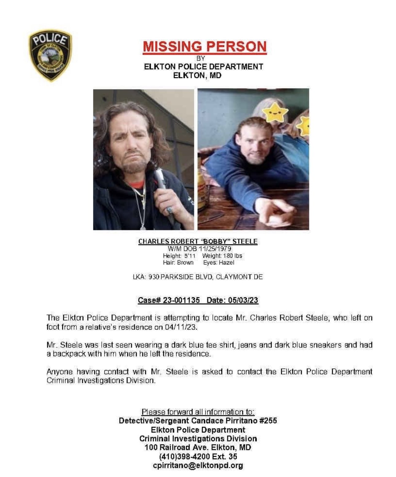 If you have any information, please call the Elkton, MD police dept at 410-398-4200